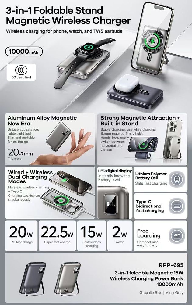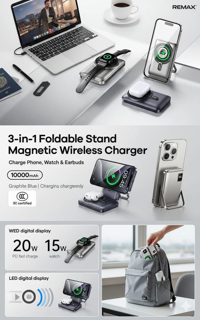 Lleva tu energía a otro nivel con el Power Bank Magnético 3 en 1 REMAX RPP-695, diseñado para quienes buscan potencia, comodidad y estilo en un solo dispositivo.